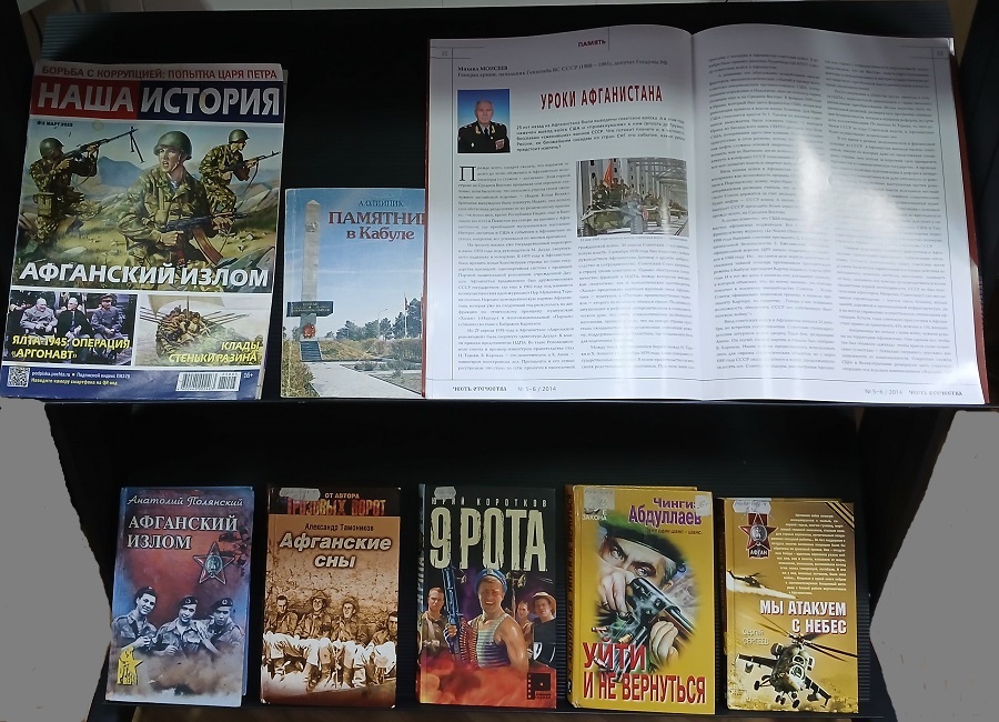 В читальном зале библиотеке оформлена книжная выставка-память «Имя подвига – Афганистан». Литература, представленная на выставке, рассказывает о героических страницах нашей истории, о солдатах и офицерах, проявивших мужество и героизм.