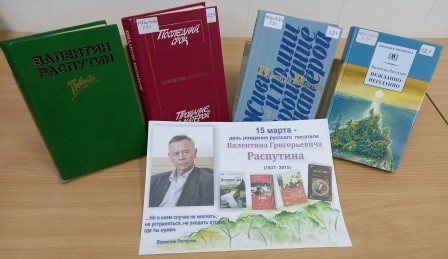 В библиотеке на книжной выставке представлены произведения В. Распутина, где автор раскрывает темы нравственности, доброты, любви и понимания.