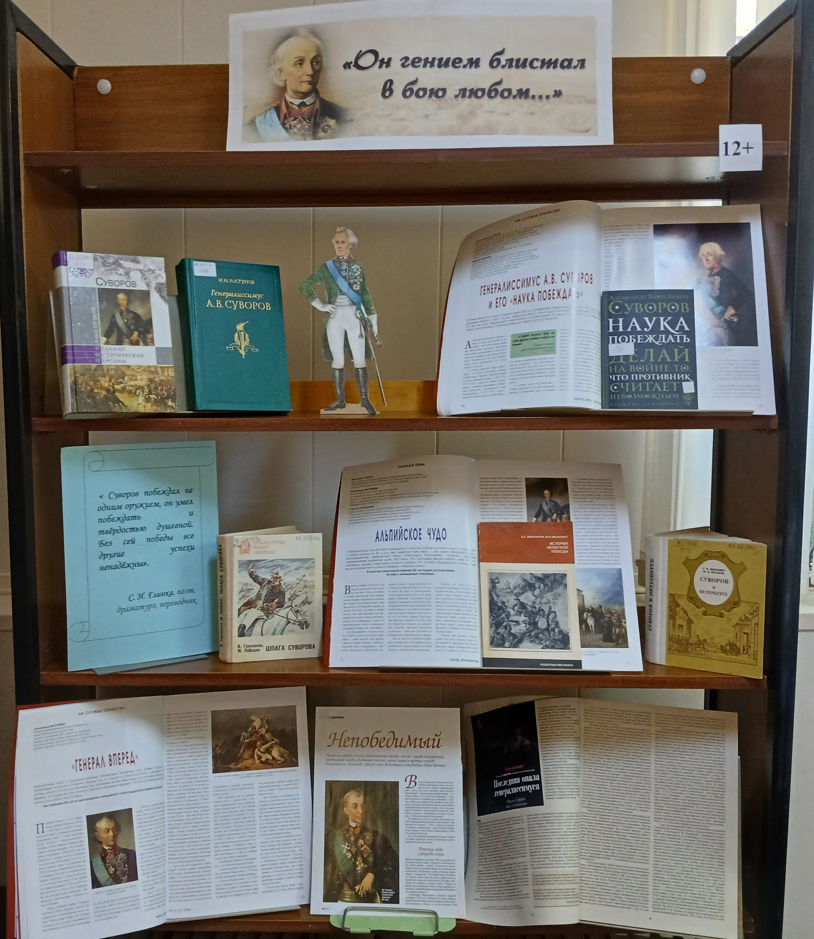 Этому уникальному человеку посвящена книжная выставка « Он гением блистал в бою любом...». Литература, представленная на книжной выставке, посвящена жизненному и военному пути великого полководца от рядового Семёновского полка до Генералиссимуса русской армии.