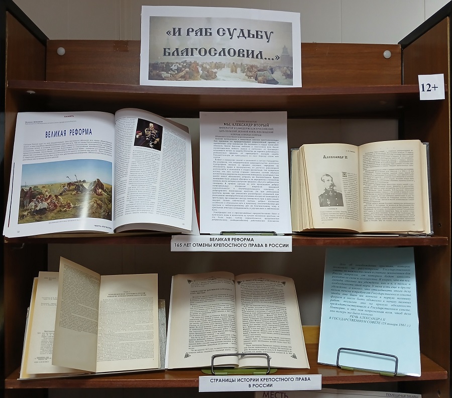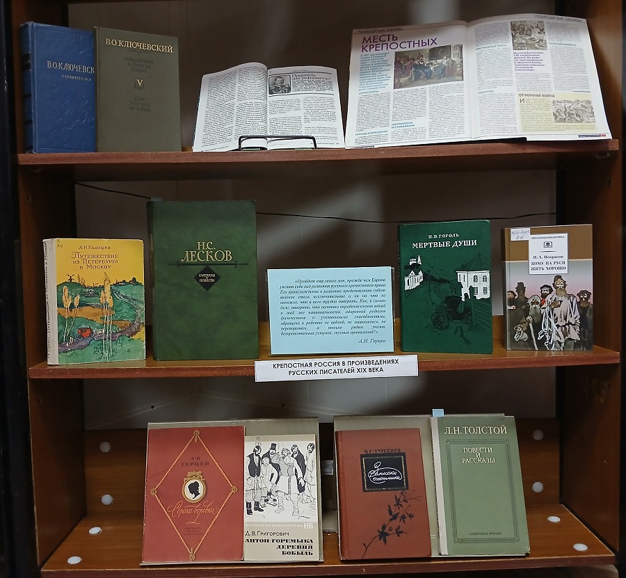 В разделе выставки «Крепостная Россия в произведениях русских писателей XIX века» представлены: книга «Путешествие из Петербурга в Москву» А.Н. Радищева; поэма Н.А. Некрасова «Кому на Руси жить хорошо»; «Записки охотника» И.С. Тургенева, после прочтения которых Александр II сказал, что его ни на минуту не оставляла мысль о необходимости освободить крестьян; поэма-роман «Мертвые души» Н.В. Гоголя; повесть «Сорока-воровка» А.И. Герцена, повесть «Антон-Горемыка» и рассказ «Деревня» Д.В. Григоровича, рассказы Н.С. Лескова «Тупейный художник» и Л.Н. Толстого «Утро помещика». Чтение этих произведений, переносит в эпоху крепостничества и знакомит с тяжелой жизнью крепостного народа.
