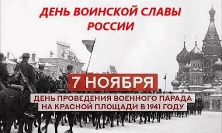 День воинской славы России — День проведения военного парада на Красной площади в городе Москве в ознаменование двадцать четвертой годовщины Великой Октябрьской социалистической революции (1941 год), отмечаемый в нашей стране ежегодно 7 ноября, установлен Федеральным законом № 32-ФЗ от 13 марта 1995 года «О днях воинской славы и памятных датах России».