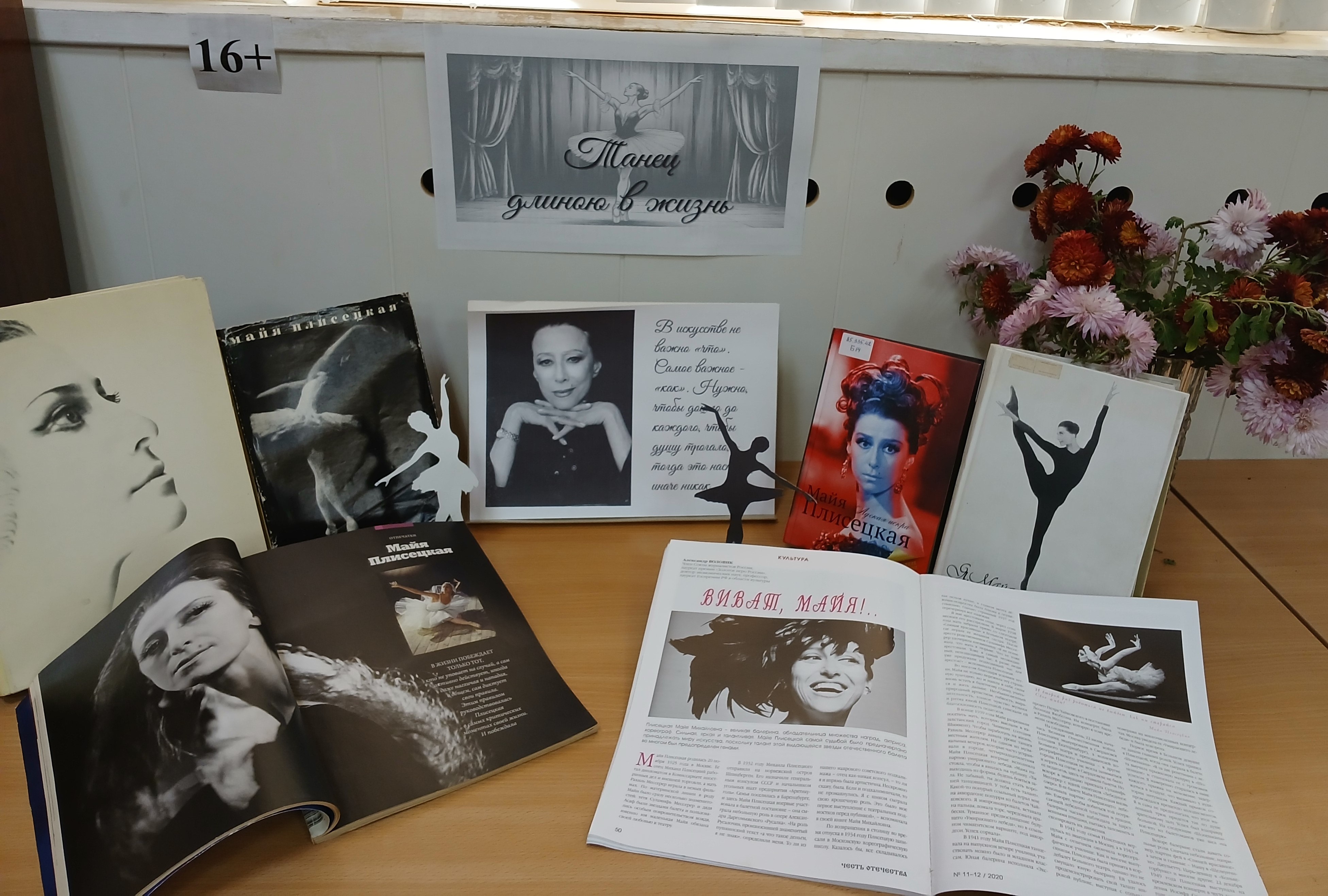 В читальном зале библиотеки представлена книжная выставка - бенефис «Танец длиною в жизнь», посвященная великой балерине. Здесь представлены книги, журналы, альбом и автобиография, рассказывающие о жизни и творчестве М.М. Плисецкой.