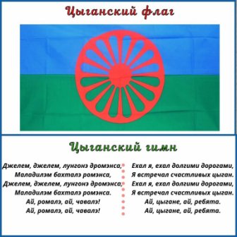 У цыган есть флаг с двумя горизонтальными полосами (верхняя — синяя, символизирует небо; нижняя — зелёная, траву и поля). В центре флага расположено красное восьмиспицевое колесо, которое символизирует традиционное кочевье и «вечное кочевье духа».