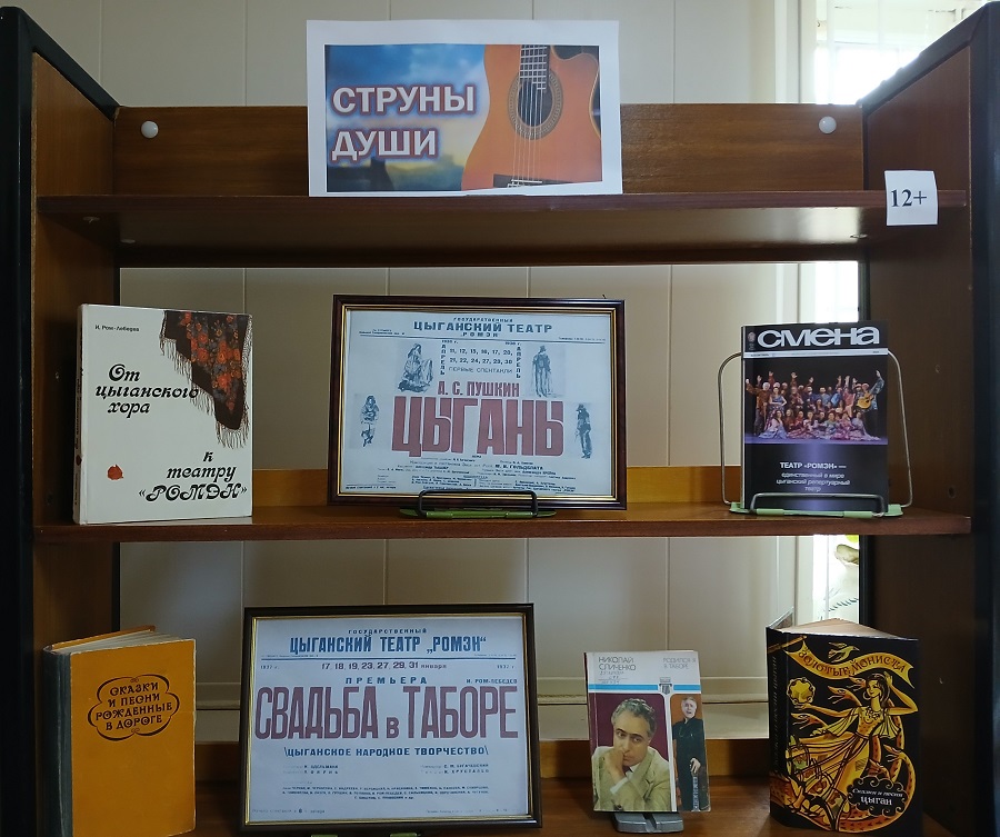 Выставка-портрет « Струны души», оформленная в читальном зале библиотеки знакомит с историей театра «Ромэн».