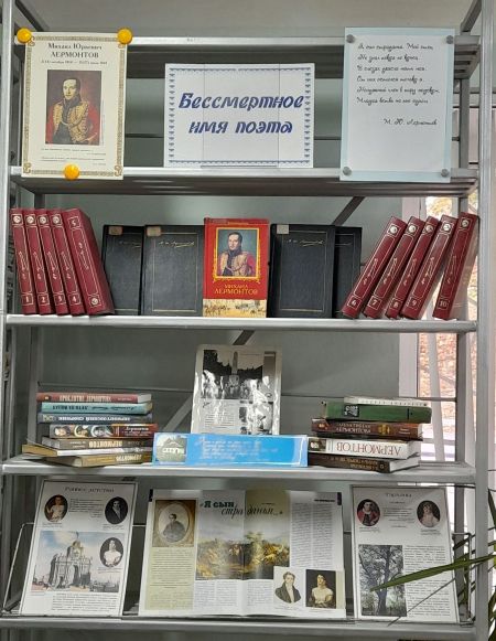 Михаил Юрьевич Лермонтов заслужил право на вечную память жителей России. Он один из самых дорогих и любимых русскими читателями, один из самых загадочных поэтов. Раскрыть некоторые из тайн судьбы Михаила Лермонтова помогут книги, представленные на выставочной экспозиции «Бессмертное имя поэта».