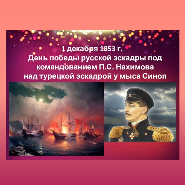 1 декабря с 1995 года в России отмечается День воинской славы в честь победы российского флота под командованием вице-адмирала Павла Нахимова над турецкой эскадрой у мыса Синоп в 1853 году. Турецкая эскадра была разгромлена в течение нескольких часов. Это крупное сражение Крымской войны вошло в историю как последнее крупное сражение парусных флотов.