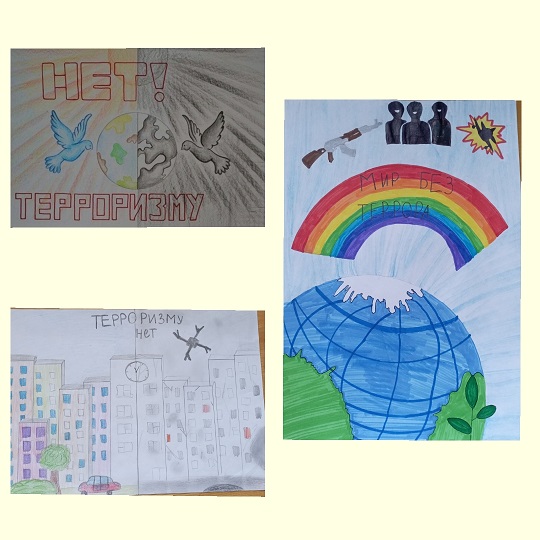 В Центральной библиотеки представлены рисунки, на которых дети старались изобразить, как бы выглядел наш мир без террористических угроз.